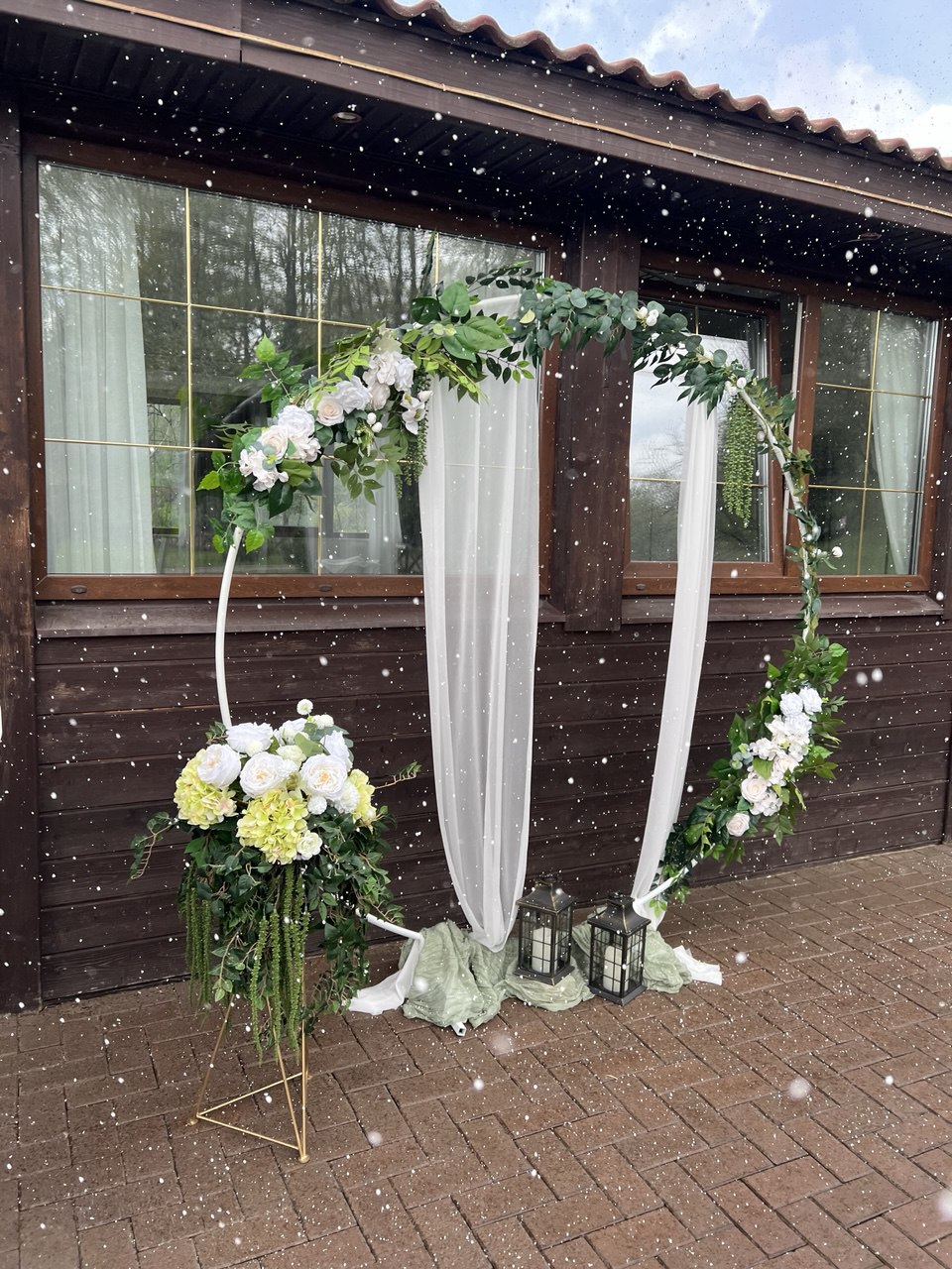 Нежная и элегантная арка «Круг» сделает вашу свадьбу незабываемым и чарующим. В аренду предлагается полная комплектация, включающая не только саму разборную арку, но и цветочные композиции, два фонаря с LED-свечами и качественную драпировочную ткань.