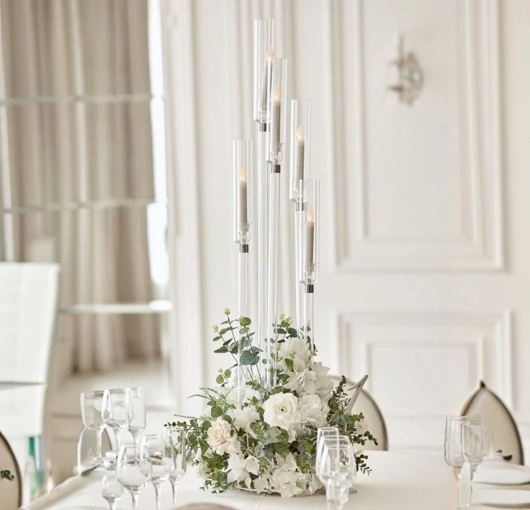 Оживите атмосферу вашего мероприятия с большим прозрачным акриловым канделябром, оснащённым пятью уровнями для электронных свечей. Добавив элемент элегантности и аристократичности, канделябр станет гармоничным дополнением к вашему торжеству.